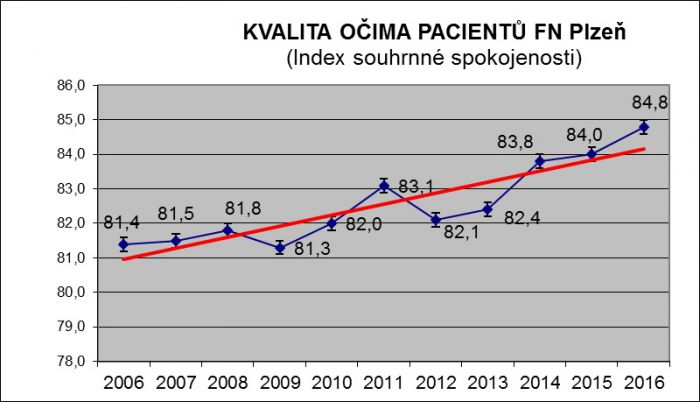 Dynamika souhrnné spokojenosti ve Fakultní nemocnici Plzeň.  Graf ukazuje výsledky více než desetileté systematické práce s projektem KVALITA OČIMA PACIENTŮ za období 2006 až 2016.
