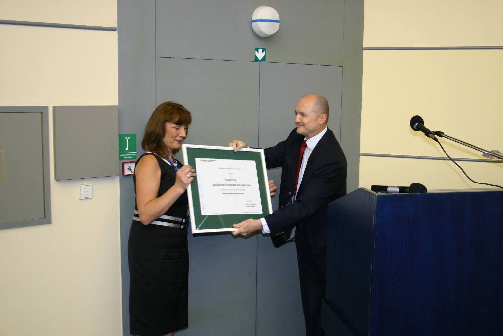 ÚVN - Vojenská fakultní nemocnice získala certifikát SPOKOJENÝ PACIENT v kategoriích "Lůžkové zdravotnické zařízení" a "Sestry lůžkových zařízení". Náměstkyně ředitele paní Mgr. Lenka Gutová přebírá certifikát z rukou řešitele projektu KVALITA OČIMA PACIENTŮ Tomáše Raitera.