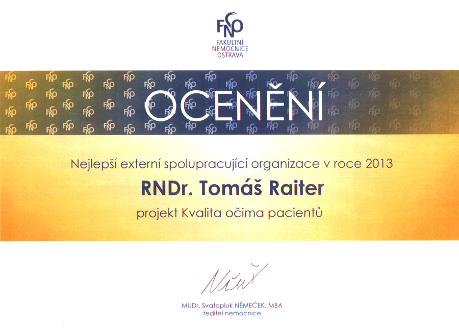 27. 3. 2018 - Dnes se uskutečnila na poradě primářů a vrchních sester v Oblastní nemocnici Příbramprezntace výsledků projektu KOP 2017. Nemocnice měla nejlepší výsledky ze všech nemocnic zřizovaných Středočeským krajem a jako jediná se ve srovnání s výsledky projektu po 10 letech dokázala zlepšit. Ředitel nemocnice MUDr. Stanislav Holobrada převzal certifikát SPOKOJENÝ PACIENT z rukou řešitele projektu RNDr. Tomáše Raitera.