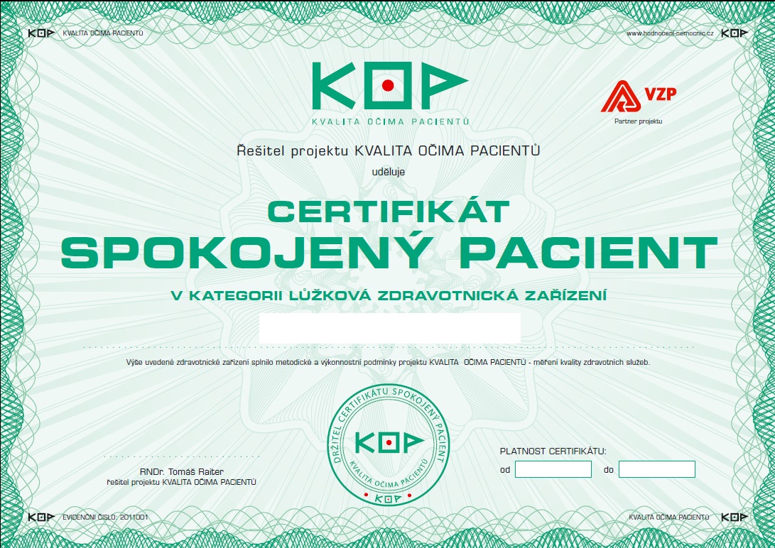 MZ ČR se rozhodlo po vyhodnocení třetího ročníku sběru dat v přímo řízených organizacích zahájit pravidelné oceňování těch zdravotnických zařízení, která doporučenou metodiku respektují a dosahují při její aplikaci nadstandardních výsledků, udělením certifi kátu „SPOKOJENÝ PACIENT“. V tomto záměru pokračuje i v roce 2012 řešitel projektu KOP. Sledujeme tím podporu projektu směřujícího ke zvyšování kvality zdravotních služeb, zvýšení informovanosti veřejnosti o výsledcích těchto šetření a podporu motivace dalších zdravotnických zařízení pro zapojení do projektu KVALITA OČIMA PACIENTŮ, v rámci kterého se měření realizuje.