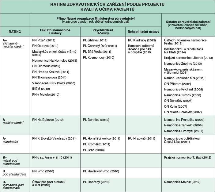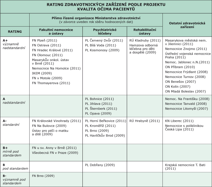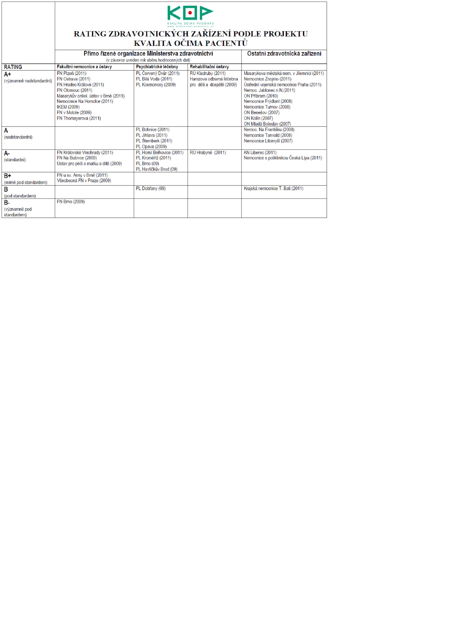 Rating KOP zahrnuje všechna hodnocená zdravotnická zařízení rozřazená podle dosažených výsledků spokojenosti pacientů do 6 kategorií (A+,A, A-, B+, B, B-). Podmínkou pro přidělení ratingu zdravotnickému zařízení je pouze splnění metodického minima (návratnost dotazníků nad 50 %, správný způsob sběru podle standardu vydaném ve Věstníku MZČR 2008/3).